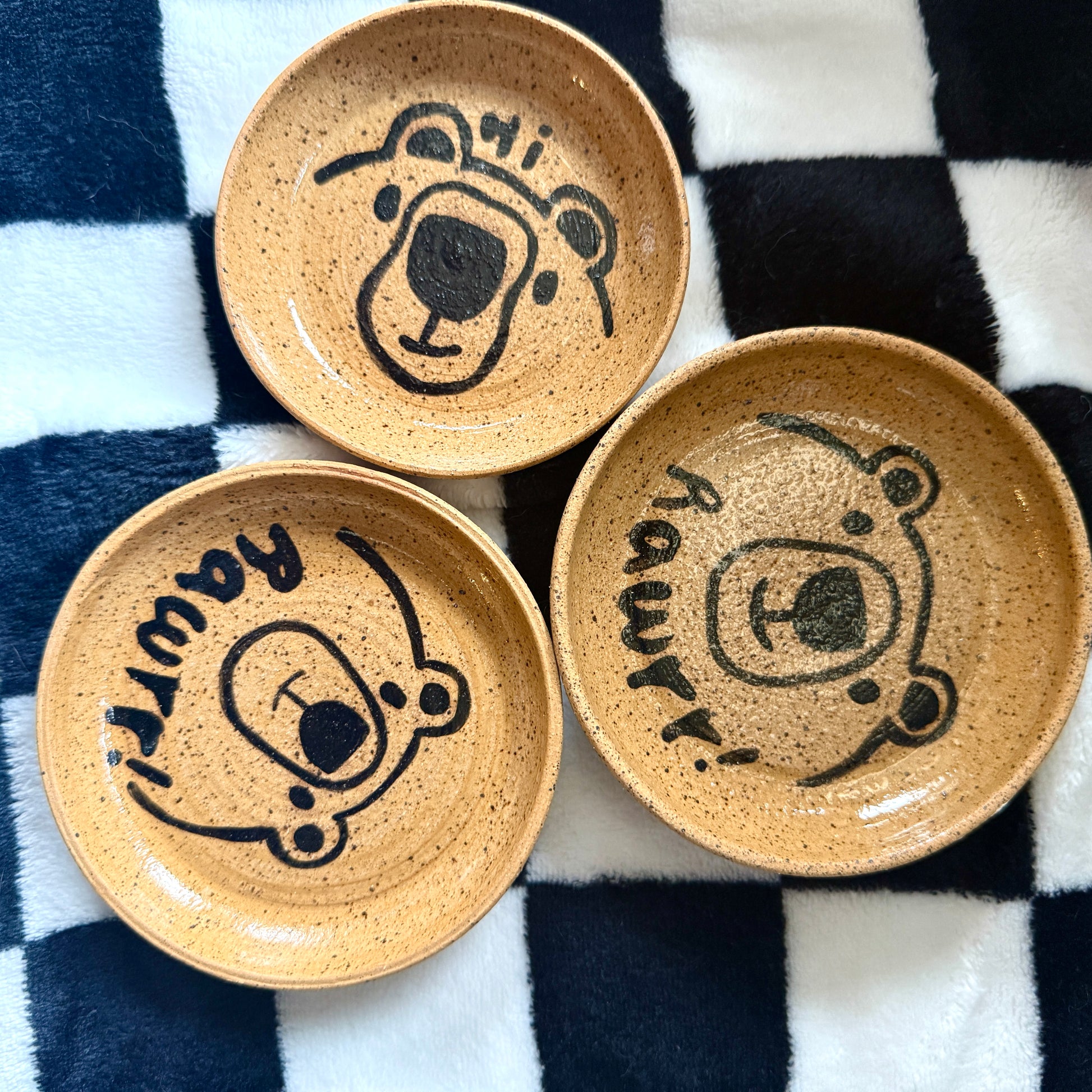 Made with brown clay and painted individually. Glossy finish! These are super versatile, great for coasters, mini plates, jewelry dishes (and everything else you can possibly think of!) these dishes are dishwasher and microwave safe.