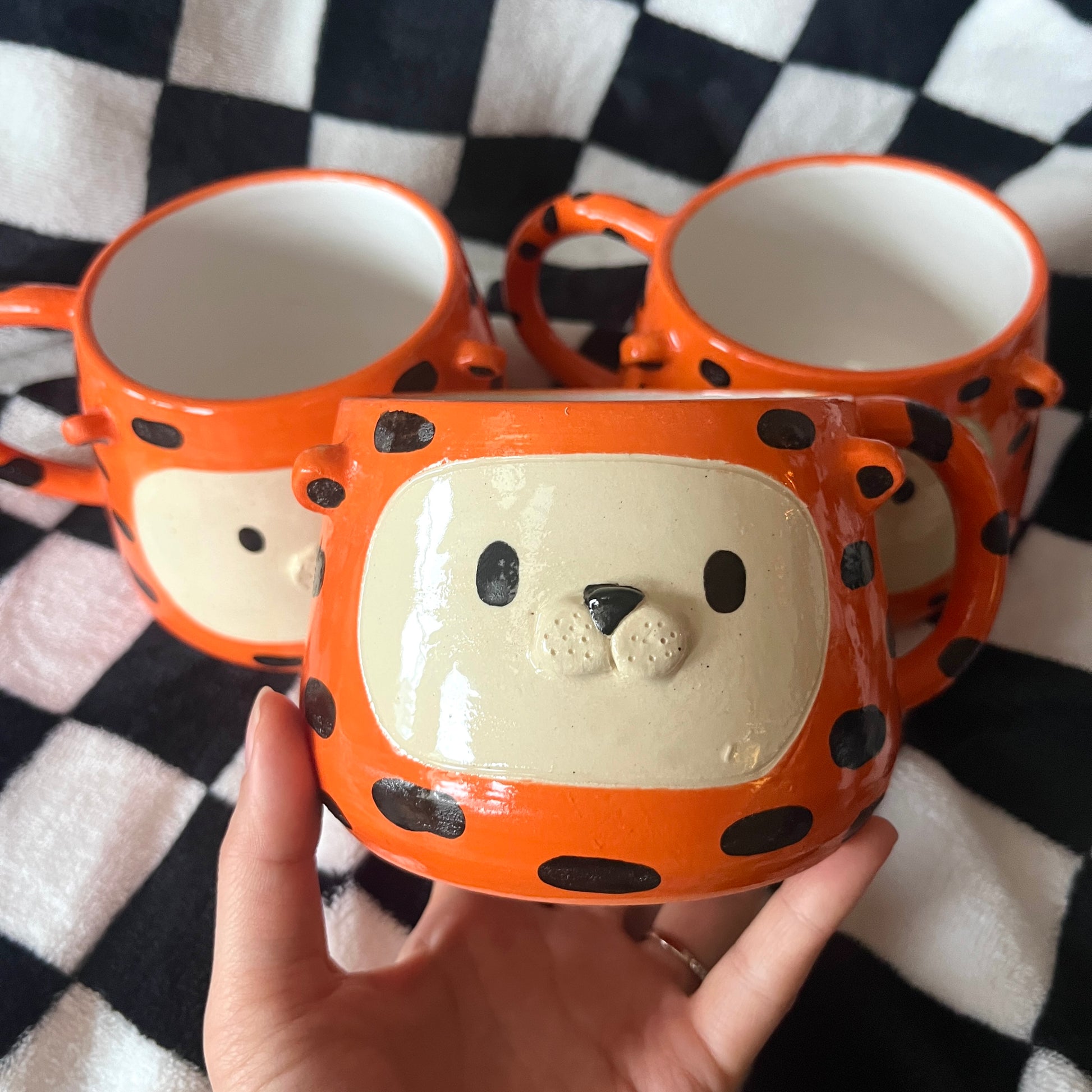 Made with beige clay and painted with underglaze with glossy finish! 🐆 Inside the mug is covered with glossy white glaze.
